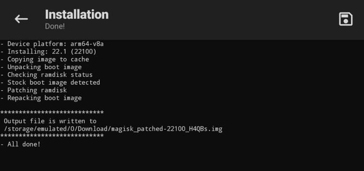 - Ứng dụng Magisk sẽ vá toàn bộ tệp phần sụn để [Internal Storage]/Download/magisk_patched_[random_strings].tar