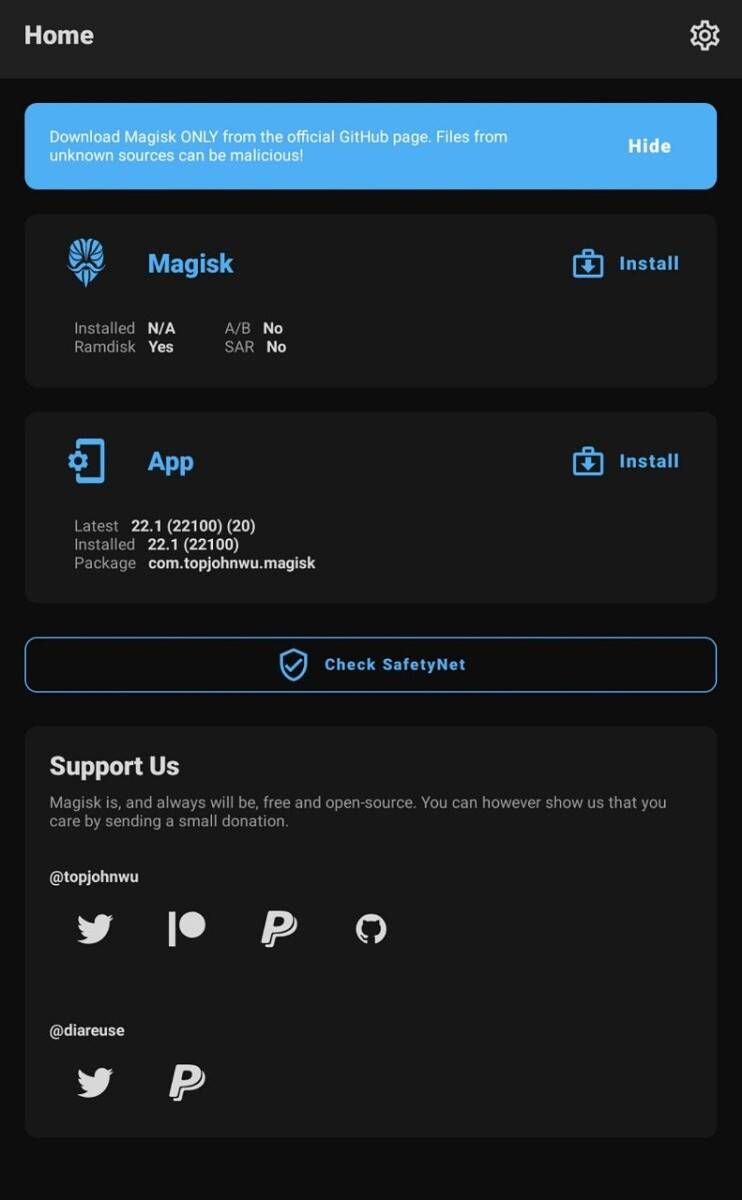 Sau khi cài đặt, hãy mở ứng dụng Magisk. Bạn sẽ thấy một màn hình như thế này: